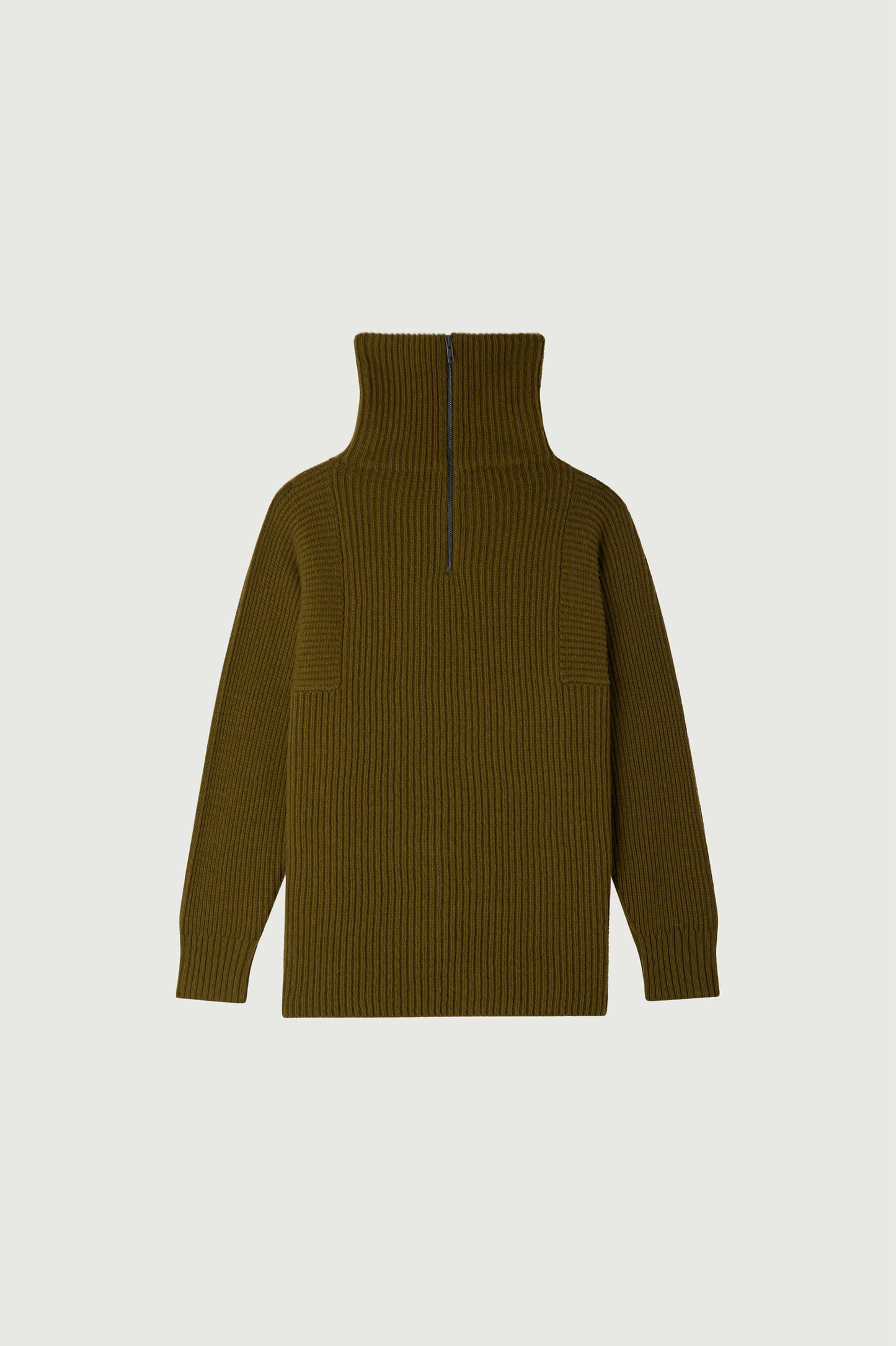 VISBY est un pull col camionneur inspiré du vestiaire masculin, confectionné en laine mérinos. Il présente un col montant zippé, à porter ouvert ou relevé, ainsi qu'un jeu de mailles côtelées qui donne du relief à sa couleur vert kaki. Sa coupe est volontairement oversize, deux fentes aux côtés twistent également le modèle.