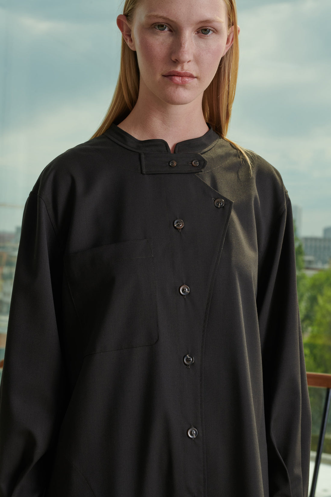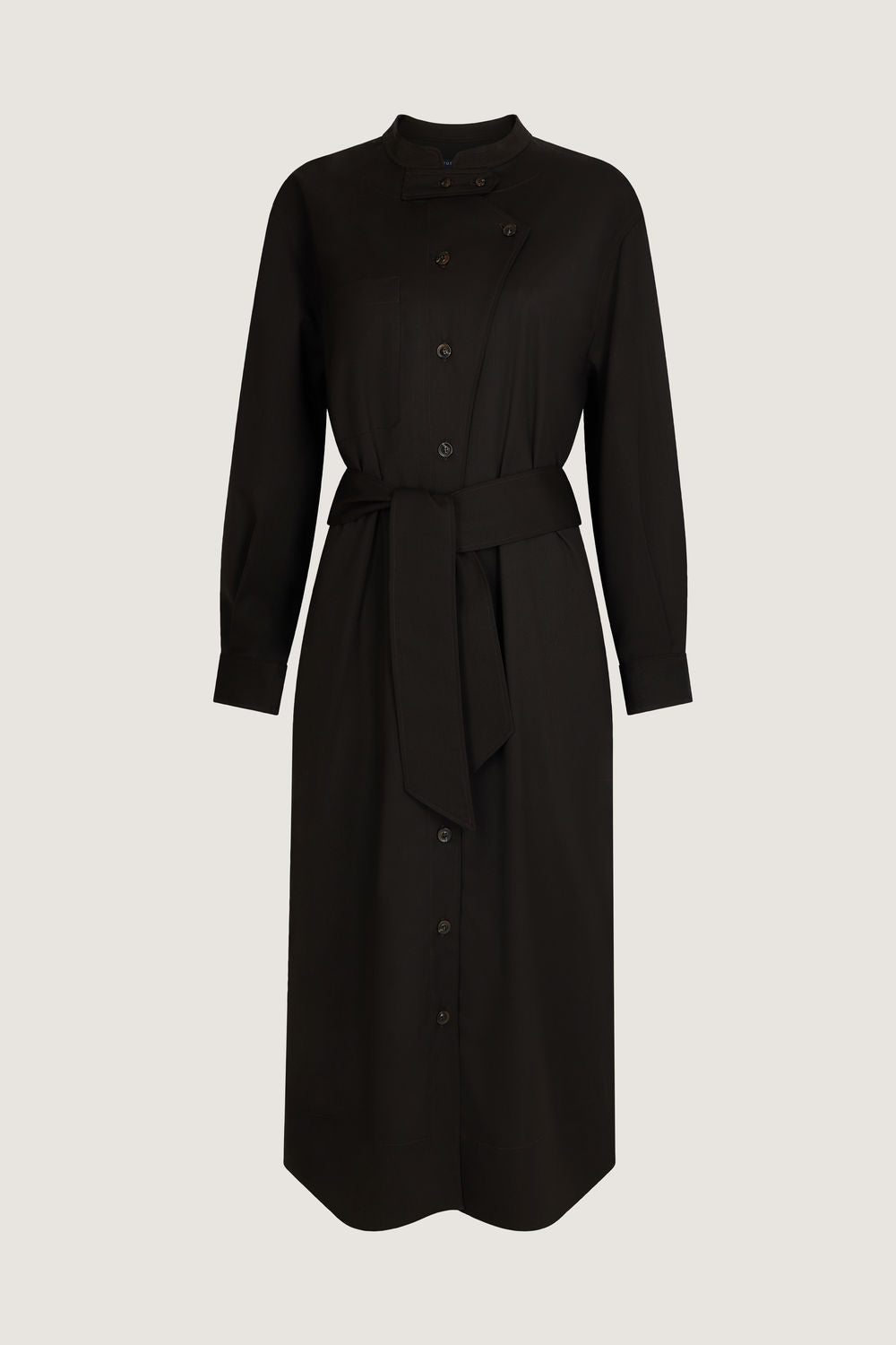 Robe en gabardine de laine légère - Coupe longue et volume droit, se porte avec ou sans ceinture- Encolure ronde- Ouverture boutonnée asymétrique devant- Patte de serrage à l'encolure- Manches longues avec poignets de chemise boutonnés- Une poche poitrine plaquée- Poches inserées dans les coutures côté- Ceinture amovible
